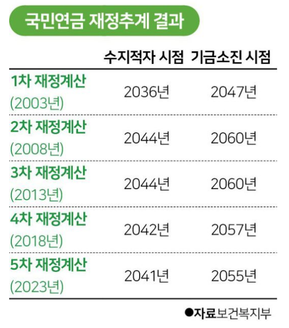 물론 국민연금 기금이 2055년 소진된다는 결과는 연구 보고에 의한 것인데요. 저출산과 고령화로 신인구부족으로 인하여 예상 소진 시점이 매 발표때마다 점점 빨라지고 있는건 사실입니다. 보고에 따르면 2041년에 적립 기금이 적자로 전환된다고 하니, 향후 20년간은 10년 이상 납입을 하는 사람들이 점점 줄어든다는 이야기로 보입니다. 이는 수급자는 많아지는데 납부할 인구가 점점 줄어들다보니 결국 다른 제도나 방향성을 가지지 못하는 지금 현 상태로서는 기금이 적자로 전환 된 후 소진이 될 수 밖에 없다는 것이지요. 연금개혁이 필요한 시기이므로 연금 인상등을 위하여 미리 발표를 한 것이 아닌가 싶습니다.
